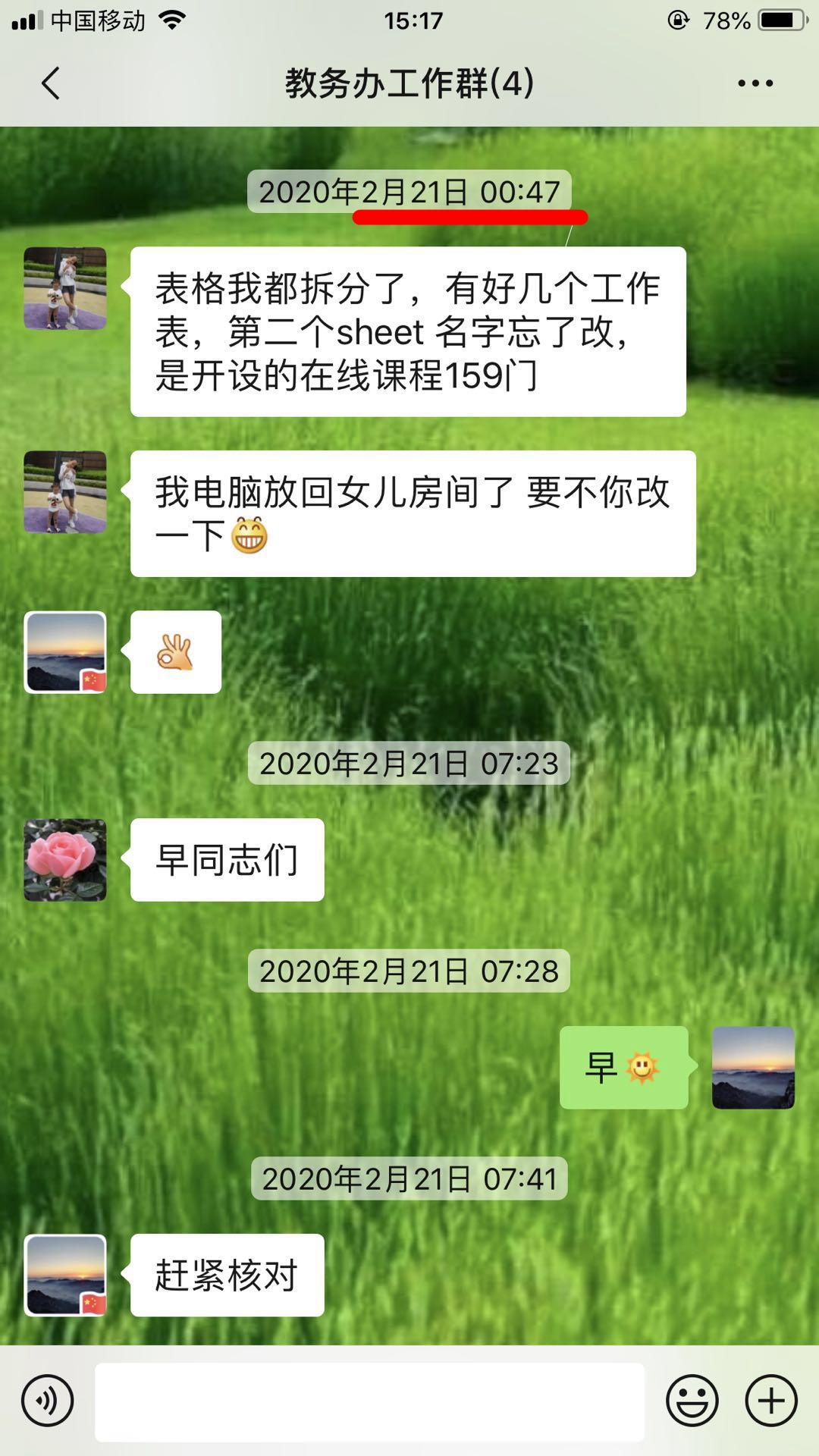 自通知发布以来,教务一线工作人员一直在加班加点,经常忙到半夜,在第一时间认真学习学校、学院相关文件,相继出台了系列文件、方案,有条不紊地开展课程核查、师生发动、问卷调查、培训组织、统计汇总等一系列工作。一方面反复论证本学期课程的开设和调整方案,统筹协调线上时间安排,提供全面的教学服务保障;另一方面及时通过学院各通信平台包括邮件、微信群、QQ群、钉钉群等方式,向学院教师发布疫情防控期间最新教学工作安排。做好了老王论坛