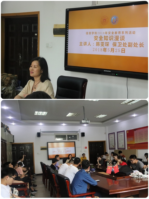 2018年上半年安全教育系列活动之安全教育讲座顺利举行,校保卫处副处长韩雯琛主讲,学院院长助理严水英,学工办负责人以及各班班干部及学生代表参与了活动。