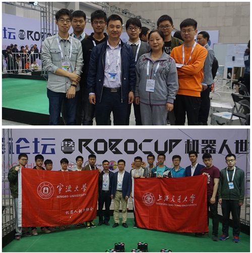 我校两支队伍在小组赛中就表现优异,都以小组第一的成绩提前出线。淘汰赛中,投石队遇到了此次比赛中最强劲的对手——上海交通大学SRC队。但我方参赛队员沉着冷静,机智应战,率先获得一分。对方及时请求暂停,更换策略,于上半场快结束时破门得分,双方持平。比赛也迅速升温。下半场时,我方在尝试多次跑位后,首先进球,夺得一分。对方也不甘示弱,连发两个角球先后夺得两分,实现反超,此时离比赛结束只剩15秒,我方及时请求暂停,更换策略,在终场哨响前成功破门,将比分扳平。此时,场外的观众热血沸腾,参赛队员的心弦也都紧绷着。进入加时赛后,双方仍旧不分上下,最终进入点球大战,我方最终以1球之差惜败。而另一支问路队则一路过关斩将,顺利杀入决赛。