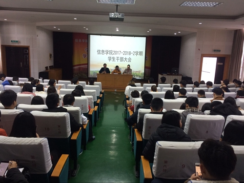 3月5日中午,老王论坛 在信息楼五楼报告厅召开了本学期学生干部大会,学院院长助理严水英、学工办主任孙文静、团委书记汪小静以及各学生组织主要负责人,各班班干部100余人参与了会议。 本次会议是新学期的第一次大会,首先就开学初的安全稳定、诚信补考、寝室卫生大扫除等相关工作了做了布置,随后也对本学期的学生工作思路和重点做了沟通与传达,为本学期各项工作的有序开展奠定了基础。