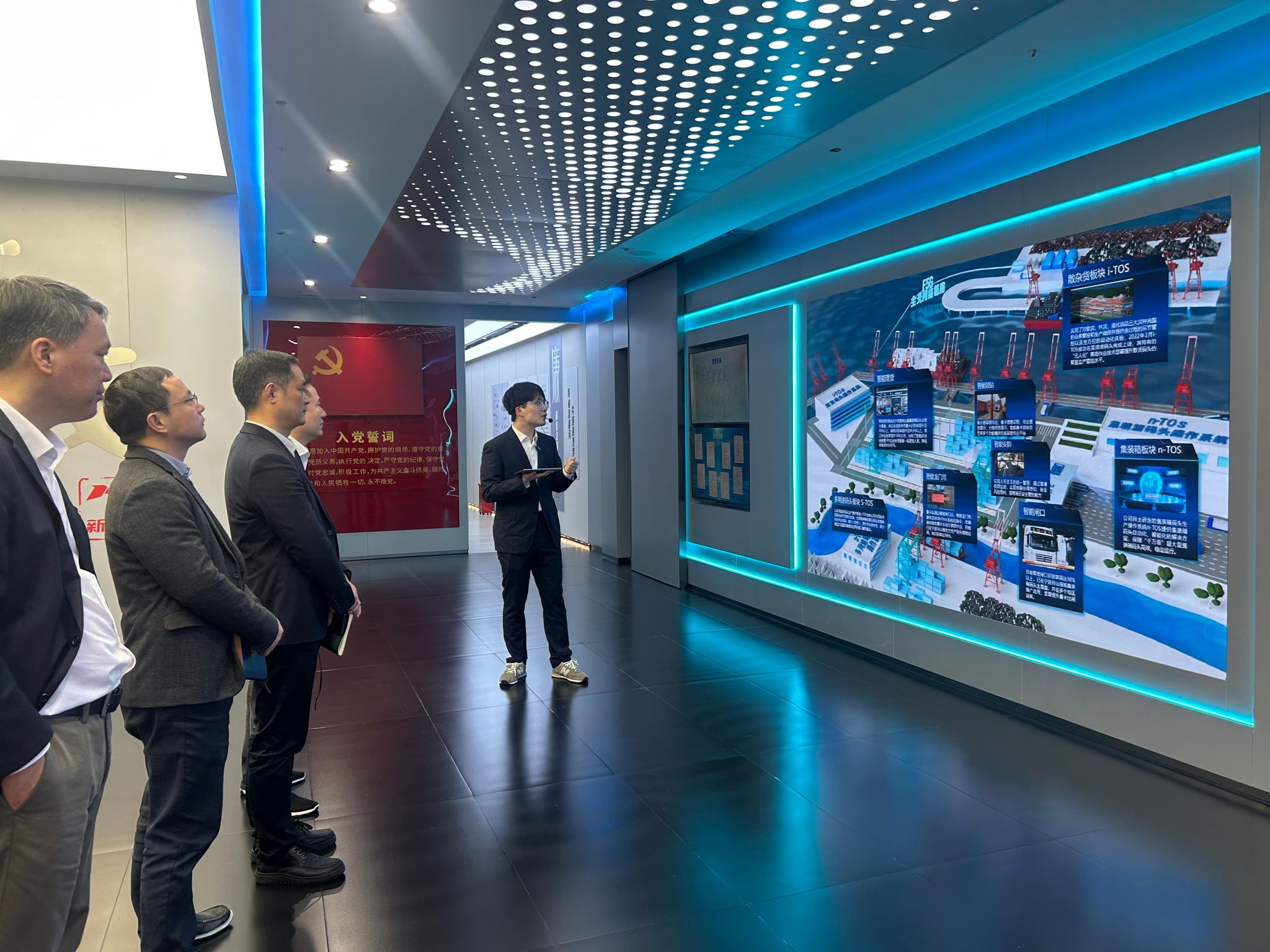 宁波港信息通信有限公司党总支书记兼董事长黄深广、党总支副书记兼总经理黄昂涛亲切接见沈祥一行。双方共同参观了公司展厅,了解了宁波舟山港股份有限公司及宁波港信息通信有限公司的发展历程和目前业务规模情况。随后,双方代表举行了座谈交流会。会上,双方就自身发展基本情况、产学研合作项目、合作机制模式等问题展开了充分讨论,本着优势互补、互学互鉴的原则双方达成了包含科研人才资源共享、港航智能化等前沿技术合作研发、高能级科创平台互帮共建、学生实习实践基地共创共建等多项合作内容。最后,双方举行了签约仪式,王强、王健代表双方进行了签约。