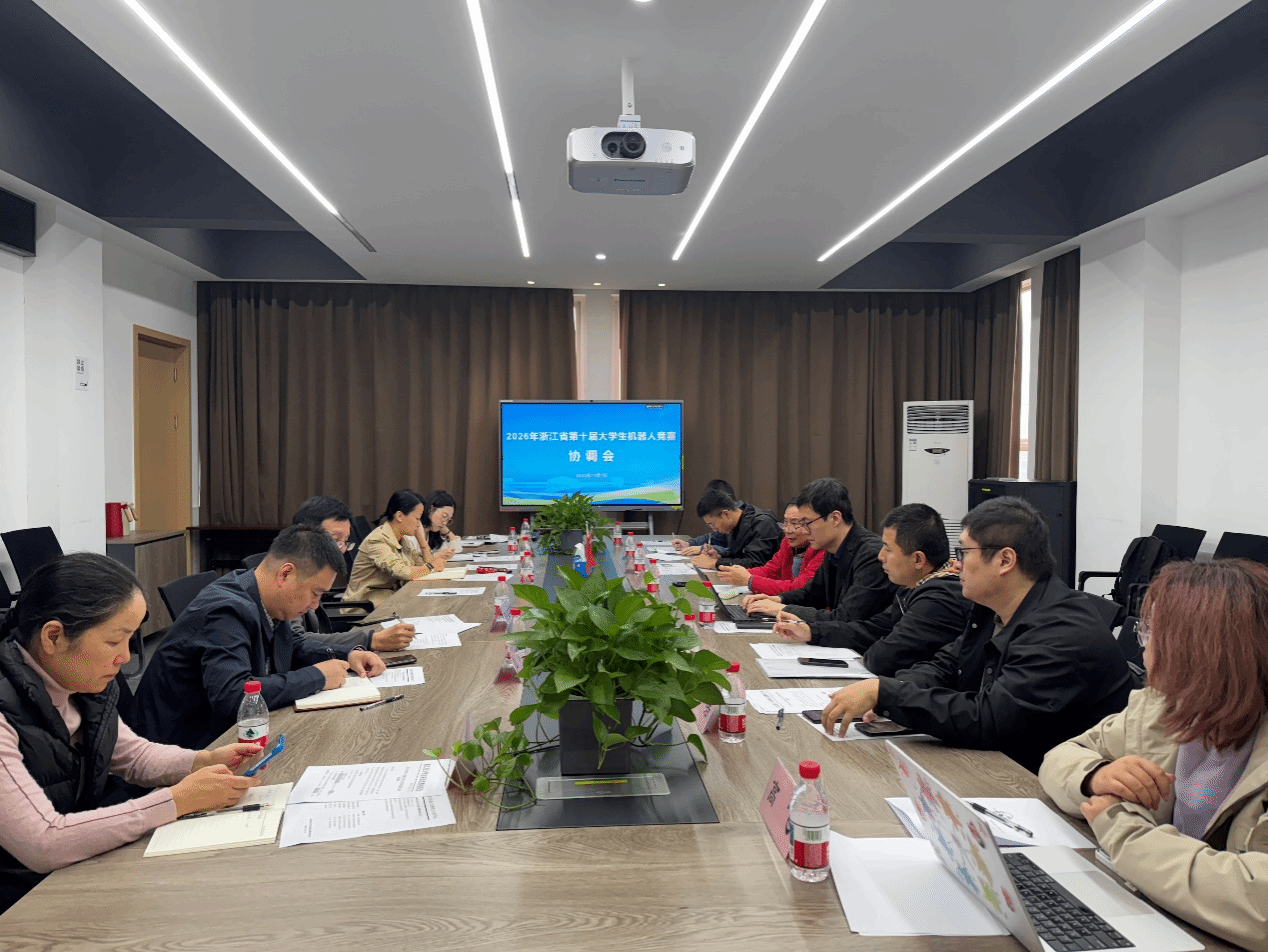 ,就2026年第十届浙江省大学生机器人竞赛的承办工作进行考察交流。竞赛委员会副秘书长周春琳,以及六大类比赛项目的技术委员会主任共同参与考察。学院副院长陈海明,学院党委副书记李洁,自动化系主任蓝艇、系副主任周歆妍,学校教务处葛翔出席会议。会议由毛一平主持。