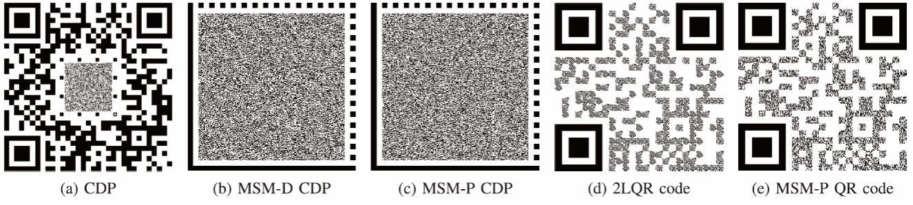 论文围绕复制敏感图形码(Copy-Sensitive Graphical Codes, CSGC)展开,提出一种将拷贝检测图案(Copy Detection Pattern, CDP)与双层二维码(Two-Level QR Code, 2LQR)统一到同一生成框架中的新方法——混合比特采样标记(Mixed-Bit Sampling Marking, MSM),在保持随机纹理抗复制能力的同时,支持私有信息携带与认证判别的统一设计。研究指出,CDP 与 2LQR 均可视为由“带信息的纹理模板”合成,MSM 在目标函数中兼顾白像素比例与空间随机性,并以可定制的相似性约束(如 DCT/皮尔逊相关)实现信息嵌入,通过两步采样算法生成既可构建 CDP、也可构建 2LQR 的纹理集合,从而实现“统一生成、按需调用”的文档认证新范式。