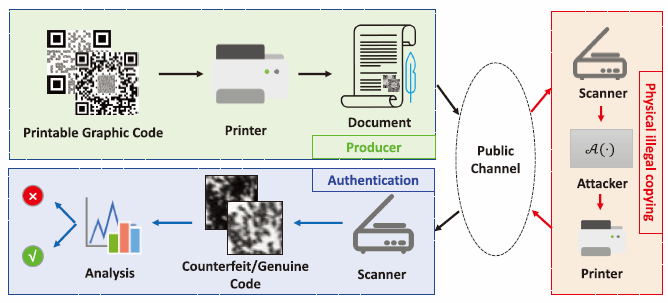 图1 复制敏感图形码在纸质文档认证中的总体流程与物理非法复制检测