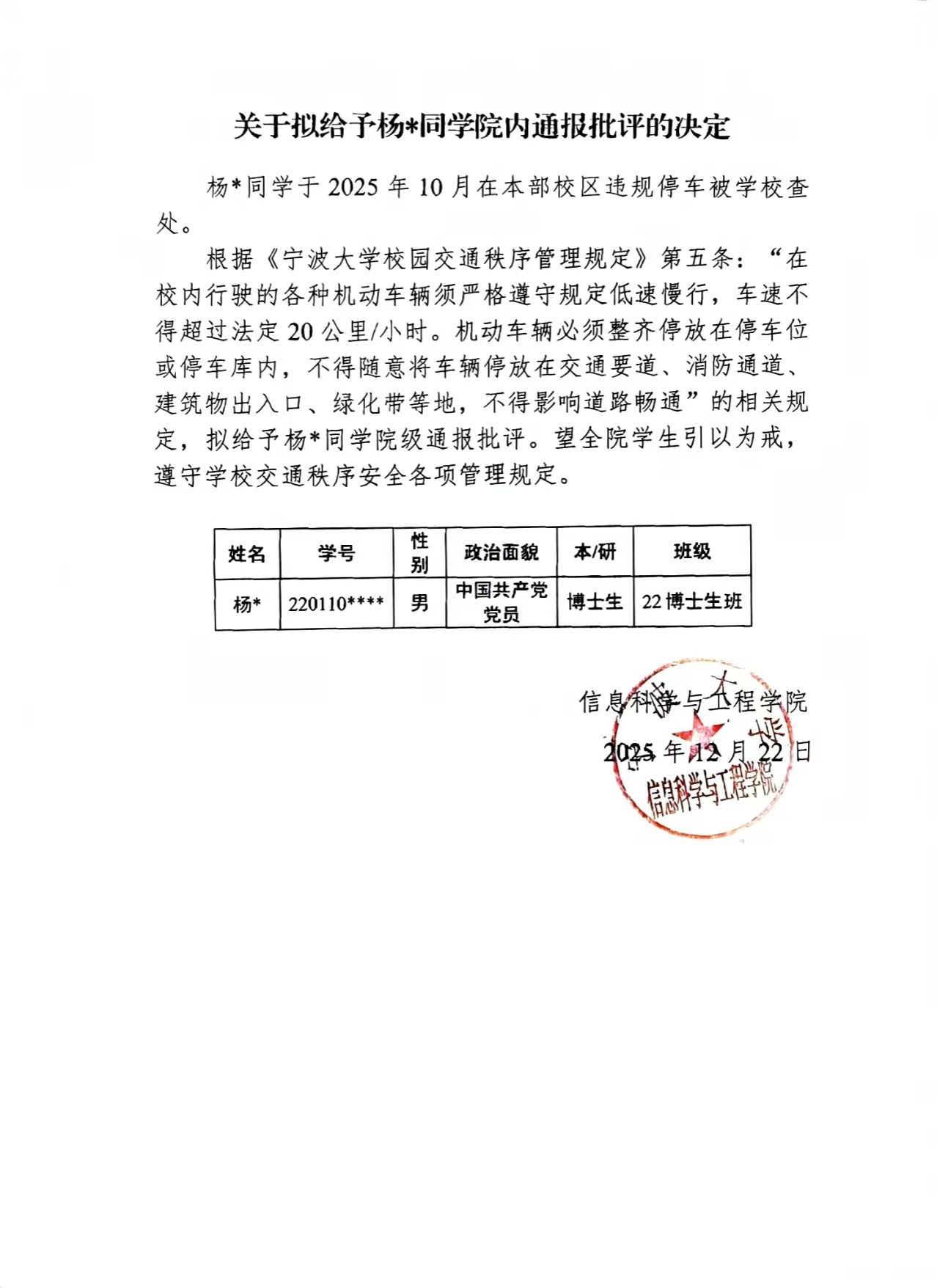 关于拟给予杨*同学院内通报批评的决定