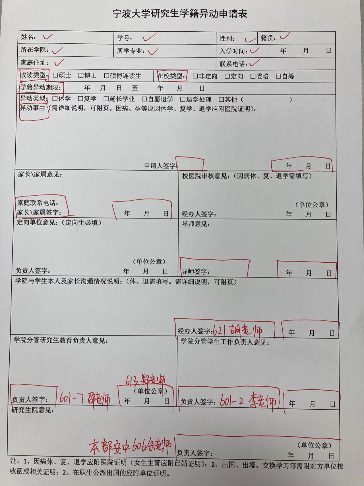 研究生学籍异动申请表》下载网址://graduate.nvpujy.com/info/1040/14943.htm,根据表格的要求相关人员签署意见后交至所在学院研究生办,研究生办老师所在根据学生申请的内容在系统内进行审核。